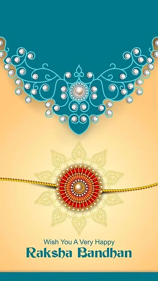 Une Carte Décorative Pour Raksha Bandhan Avec Un Design Central De Rakhi, Des Motifs Ornementaux Et Un Vœu Festif.
