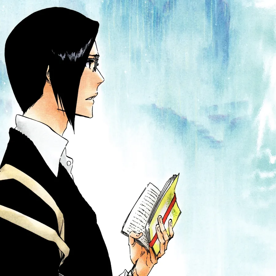 Vue De Profil D'un Jeune Homme Portant Des Lunettes Avec Des Cheveux Noirs, Vêtu D'une Chemise Blanche Avec Un Gilet Noir, Tenant Un Livre Ouvert Contre Un Fond Bleu Aquarelle.